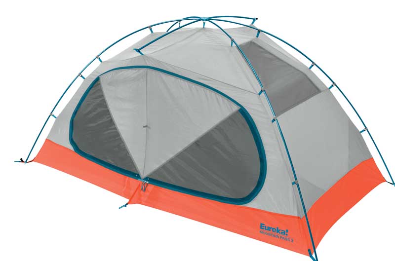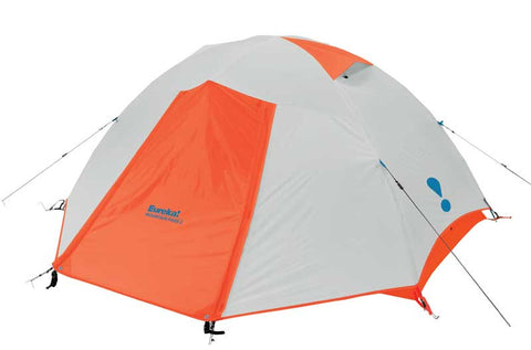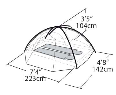 Free-standing 2-man tent, suitable for 3-4 season use.  2 doors with protective awning & vestibules.  Roof vent.  Mesh vent panels with removable covers.  5 storage pockets, plus gear loft.  Footprint (ground sheet) included.  48/56" x 88", 41" high, 5.5 lbs. min. weight.  Polyester fabrics & mesh.  9.5 mm aluminum poles.